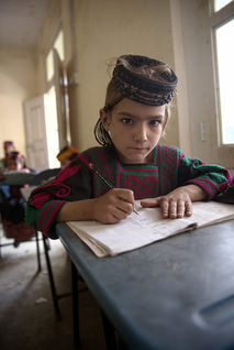 La escuela privada está ubicada en una estructura más compleja. Un patio exterior equipado para actividades recreativas y tres aulas según a la edad de los alumnos. Hay más profesores, uno de ellos, Aurang, habla un inglés perfecto. No hay escritorios y los niños están sentados en el suelo. De nuevo el mismo arreglo: los chicos sentados al frente y las chicas detrás. Por tanto, siento que no puede ser simplemente una coincidencia. Pero noto otra diferencia: las chicas llevan el velo en la cabeza. Debe ser una escuela de impostación musulmana.